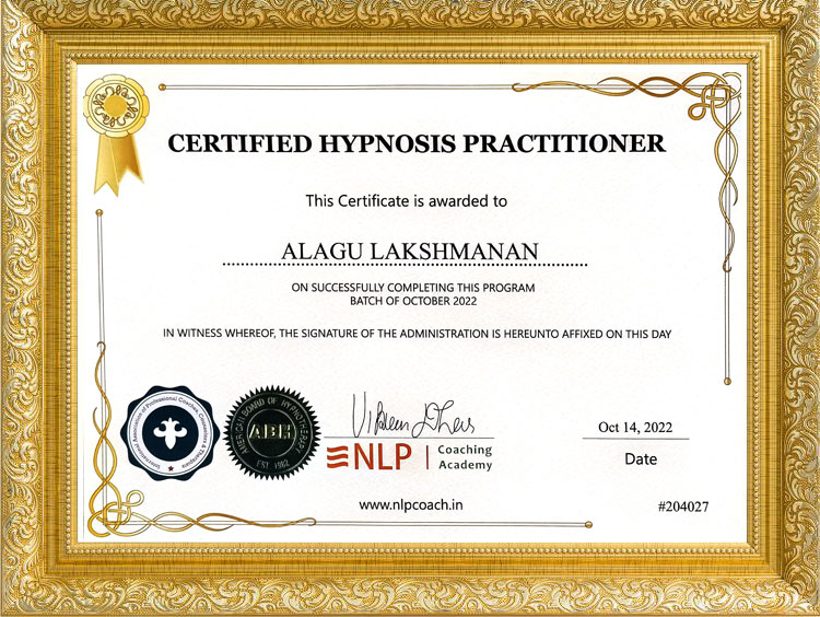 I am a Certified Hypnosis Practitioner, accredited by American Board of Hypnotherapy and International Association of Professional Coaches, counsellors & Therapists.